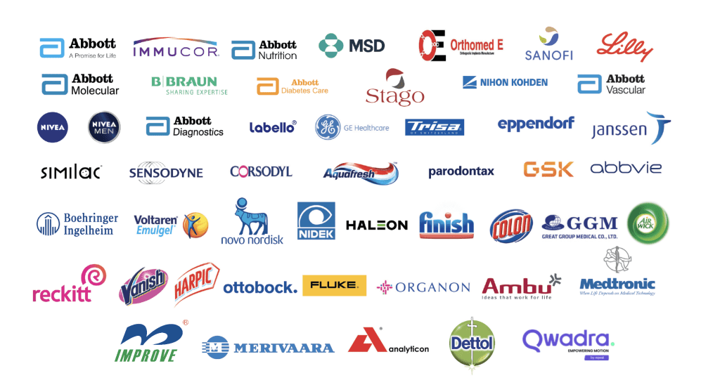 Lilly, Janssen, Abbott EPD, Abbott Nutrition International, , AbbVie, Sanofi, GlaxoSmithKline, GSK Consumer, Novo Nordisk, Boehringer Ingelheim , B|Braun, MSD, MSD Animal Health , Organon GEHC Pharma, GEHC Pharma, GEHC (Digital Imaging and Ultrasound), Medtronic (RTG & RCS), Covidien, AMBU, Merivaara , Nihon Kohden, Nihon Kohden Orangemed, Merivaara, Ambu, Fluke, Nidek, Beirsdorf (NIVEA), Trisa, GSK Oral Care, Reckitt Benckiser STAGO, Immucor, EPPENDORF, Abbott (diagnostics, Molecular, Diabetes care, Point of care, Rapid Diagnostics) وغيرها من العديد من الوكالات الأخرى.